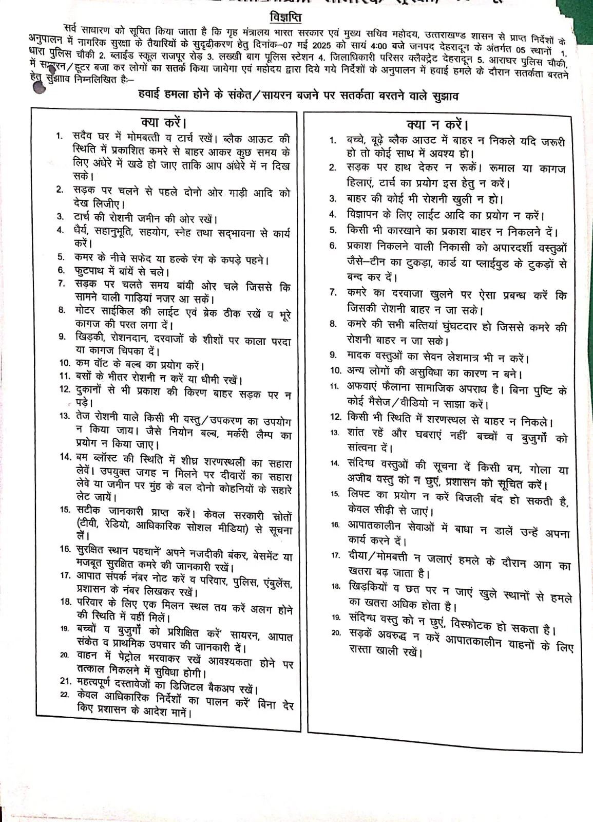 भारत सरकार के निर्देशों के अनुपालन में आयोजित इस मॉक ड्रिल का उद्देश्य नागरिक सुरक्षा तंत्र की तैयारी, समन्वय एवं आपातकालीन प्रतिक्रिया क्षमता का आकलन करना है, ताकि किसी भी आपदा अथवा आपात स्थिति में प्रभावी एवं त्वरित कार्रवाई सुनिश्चित की जा सके। जनपद अंतर्गत शहर के चिन्हित प्रमुख 4 स्थानों आईएसबीटी, डिल रायपुर, घंटाघर एवं आराघर में मॉक ड्रिल आयोजित की जाएगी। रात्रि 10ः05 बजे से इन क्षेत्रों में लगभग 30 मिनट के लिए ब्लैकआउट किया जाएगा, जिसके अंतर्गत स्ट्रीट लाइट, पार्क एवं अन्य सार्वजनिक स्थलों की रोशनी अस्थायी रूप से बंद रखी जाएगी। मॉक ड्रिल प्रारंभ होने से पूर्व संबंधित क्षेत्रों में आपातकालीन सायरन बजाया जाएगा, जिससे आमजन को संकेत प्राप्त हो सके।
