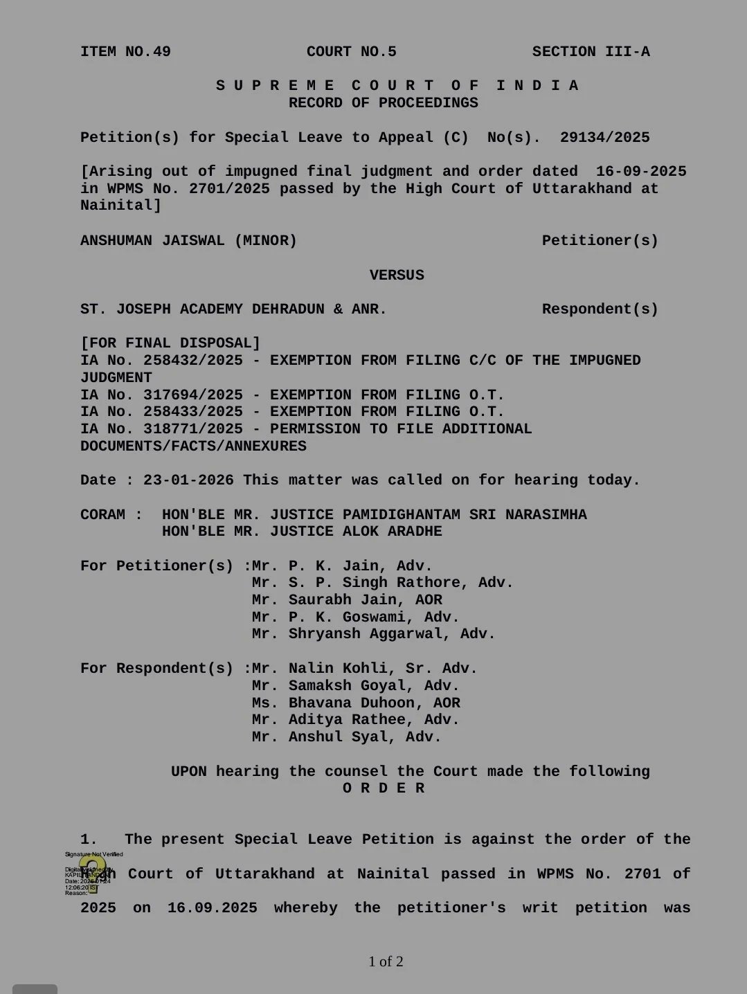 23 जनवरी को न्यायमूर्ति पी.एस. नरसिम्हा और न्यायमूर्ति आलोक अराधे की खंडपीठ ने मामले की विस्तृत सुनवाई के बाद अहम निर्णय सुनाया। अदालत ने आदेश दिया कि छात्र अंशुमान जायसवाल को 11वीं कक्षा में विज्ञान संकाय में ही पढ़ाई पूरी करने दी जाए और नियमों के अनुसार परीक्षा में शामिल होने की अनुमति दी जाए।
