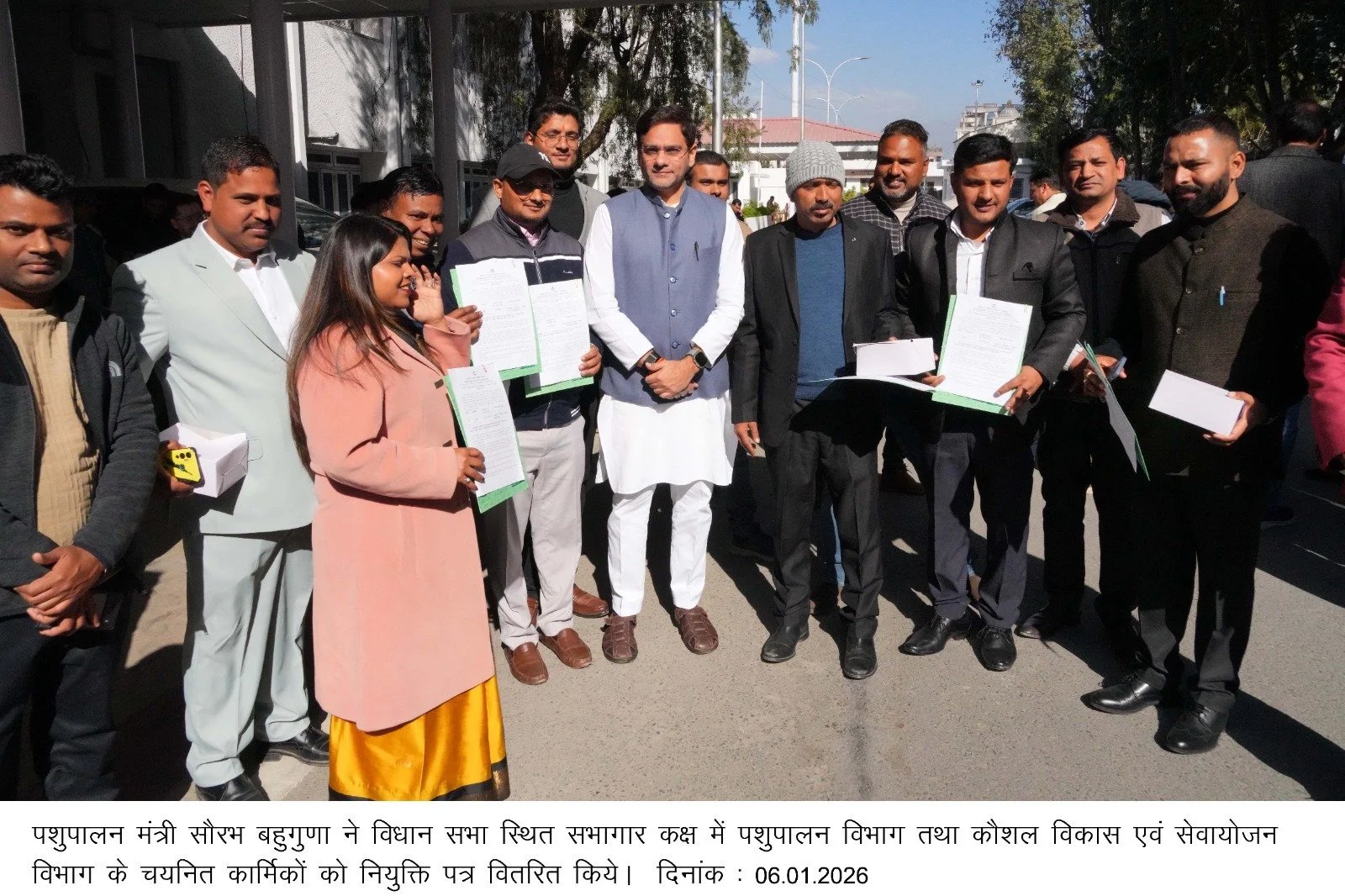 देहरादून : प्रदेश के पशुपालन मंत्री सौरभ बहुगुणा ने विधान सभा स्थित सभागार कक्ष में पशुपालन विभाग तथा कौशल विकास एवं सेवायोजन विभाग के उत्तराखण्ड अधीनस्थ सेवा चयन आयोग / राज्य लोक सेवा आयोग द्वारा चयनित कार्मिकों को नियुक्ति पत्र वितरित किये।