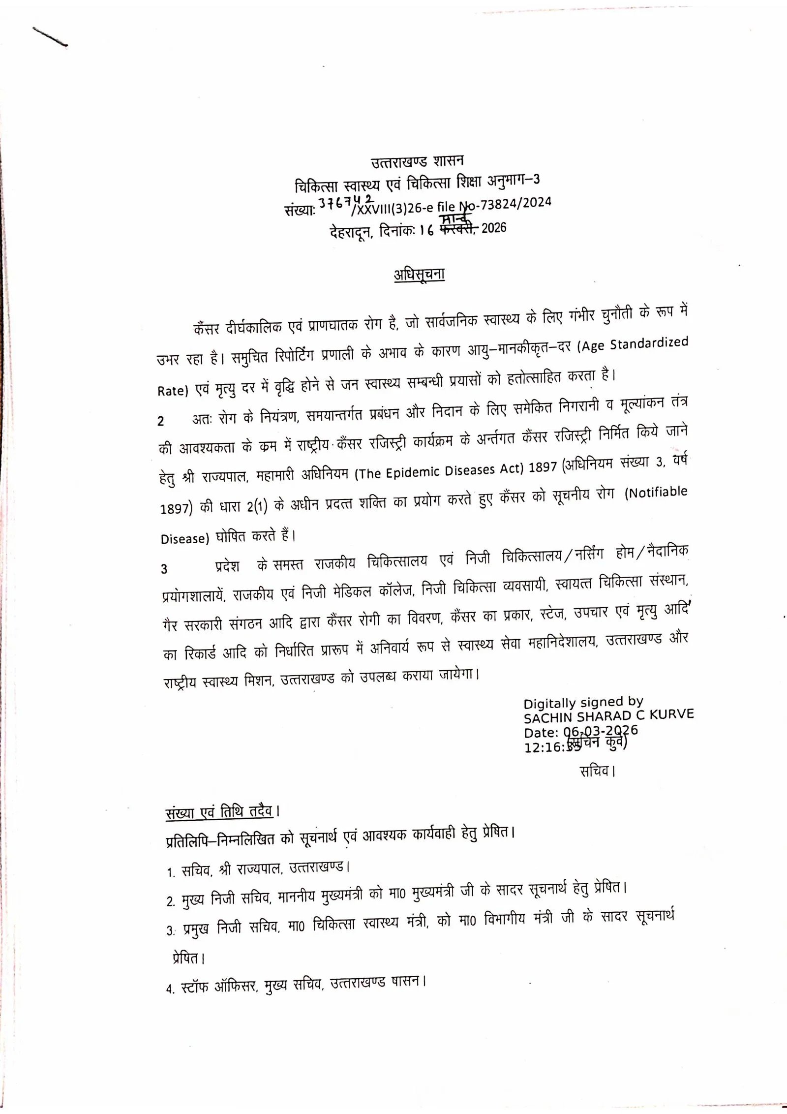 देहरादून। कैंसर जैसी दीर्घकालिक और प्राणघातक बीमारी के बढ़ते मामलों को देखते हुए उत्तराखंड सरकार ने इसे सूचनीय रोग (Notifiable Disease) घोषित कर दिया है। इस संबंध में राज्यपाल द्वारा महामारी अधिनियम 1897 की धारा 2(1) के तहत आदेश जारी किए गए हैं।