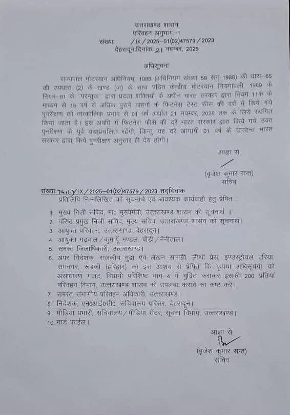 देहरादून : मुख्यमंत्री पुष्कर सिंह धामी के निर्देश पर राज्य सरकार ने उत्तराखंड के वाहन स्वामियों को महत्वपूर्ण राहत प्रदान करते हुए पुराने (15 वर्ष) कमर्शियल वाहनों की फिटनेस फीस में वृद्धि को आगामी 01 जुलाई 2026 तक स्थगित कर दिया है। इस संबंध में परिवहन विभाग द्वारा अधिसूचना जारी कर दी गई है। अधिसूचना सचिव परिवहन बृजेश कुमार संत द्वारा जारी की गई।