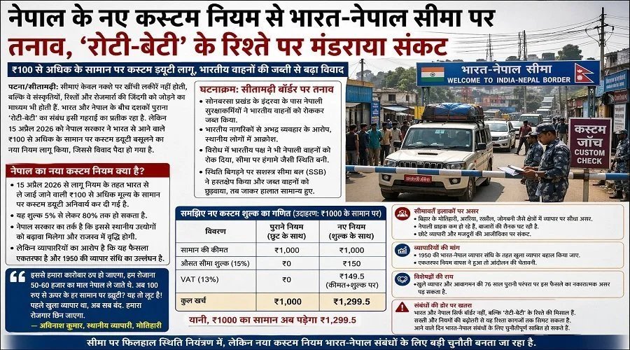 नई दिल्ली/काठमांडू : भारत और नेपाल के बीच की सीमा कभी नक्शे पर खिंची केवल एक लकीर नहीं थी; यह साझा चूल्हे और साझा संस्कृति का गलियारा रही है। लेकिन 15 अप्रैल 2026 से नेपाल की बालेन सरकार द्वारा लागू किए गए नए कस्टम नियमों ने इस सहज रिश्ते में कड़वाहट घोल दी है। ₹100 से अधिक के सामान पर भारी टैक्स की वसूली ने सीमावर्ती व्यापार को ठप कर दिया है और मानवीय संवेदनाओं को आक्रोश में बदल दिया है।