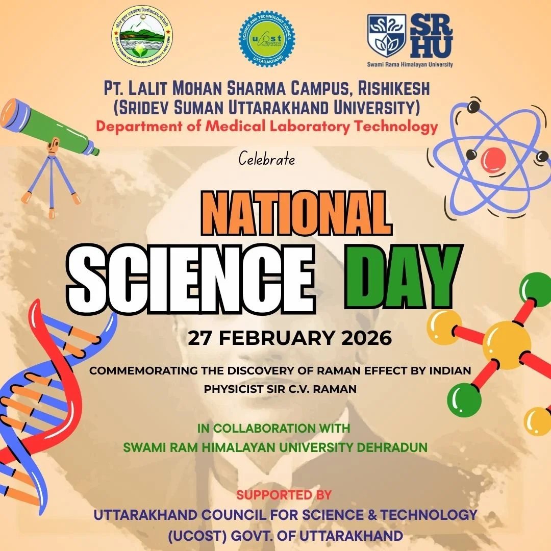 ऋषिकेश : पंडित ललित मोहन शर्मा परिसर, ऋषिकेश के मेडिकल लैब टेक्नोलॉजी विभाग व स्वामी राम हिमालयन विश्वविद्यालय, जौलीग्रांट, देहरादून के संयुक्त तत्वावधान एवं उत्तराखंड राज्य विज्ञान एवं प्रौद्योगिकी परिषद (यूकॉस्ट) के सहयोग से राष्ट्रीय विज्ञान दिवस मनाया गया।
