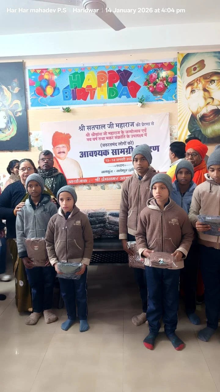 हरिद्वार : हरिद्वार सुप्रसिद्ध आध्यात्मिक एवं समाजसेवी संस्था श्री प्रेमनगर आश्रम द्वारा सतपाल महाराज की प्रेरणा से जिला कारागार रोशनाबाद में कैदियों के लिए पर्याप्त कम्बल एवं बालकुंज सलेमपुर, हरिद्वार के जरूरतमंद बच्चों के लिए वस्त्र वितरण किया गया। उल्लेखनीय है कि श्री प्रेमनगर आश्रम एक अखिल भारतीय पंजीकृत आध्यात्मिक एवं समाजसेवी संस्था है। संस्था के प्रेरणास्रोत सतपाल महाराज की प्रेरणा से श्री प्रेमनगर आश्रम समय-समय पर अनेकों समाज सेवा का कार्य करता है। जरूरतमंद लोगों को निःशुल्क राशन समाग्री, वस्त्र, कम्बल, फल, औषधि वितरण तथा रक्तदान शिविर निःशुल्क स्वास्थ परीक्षण आदि सेवा कार्य इस संस्था द्वारा किया जाता रहा है। कोरोना काल में कोरोना पीड़ितों को निःशुल्क औषधि भोजन राशन सामाग्री एवं आवास व्यवस्था जैसे सामाजिक सेवा कार्य किये गये 14 जनवरी 2026, को मकर संक्रांति के उपल्क्ष्य में सामाजिक सेवा कार्य किये गये।